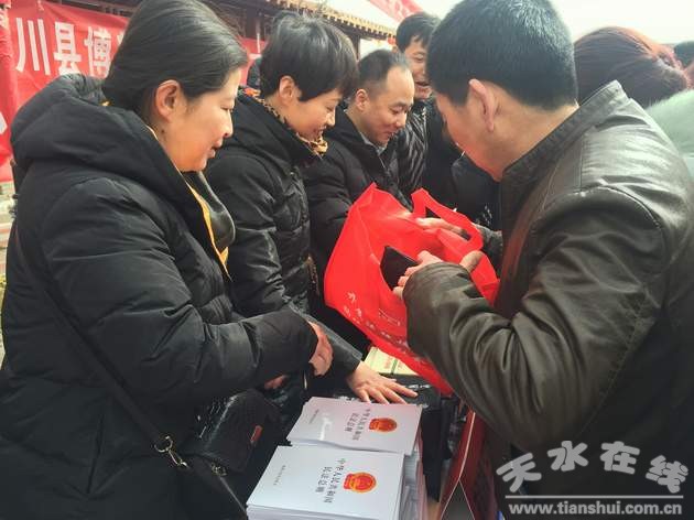 活動現(xiàn)場,天水市司法局充分發(fā)揮職能優(yōu)勢,把開展“法律進鄉(xiāng)村”活動作為貫徹落實黨的十九大精神、推動實施鄉(xiāng)村振興戰(zhàn)略、助力精準扶貧的重要工程,采取群眾喜聞樂見、易于接受的形式,通過設立咨詢臺、擺放宣傳版面、發(fā)放宣傳資料、“普法宣傳愛心包”(文具盒、中性筆、《農(nóng)村法律知識問答折頁》、《甘肅省法律援助事項及辦事流程》)、接待群眾咨詢的方式,重點宣傳了《憲法》、《勞動法》、《農(nóng)村土地承包法》等與農(nóng)村廣大干部群眾密切相關的法律法規(guī);顒蝇F(xiàn)場,共發(fā)放各類法律宣傳資料近3000份,“普法宣傳愛心包”200個,普法購物袋200余個,農(nóng)村法律書籍100本,“法律進鄉(xiāng)村”普法光盤45張,接待群眾現(xiàn)場咨詢140余人次。