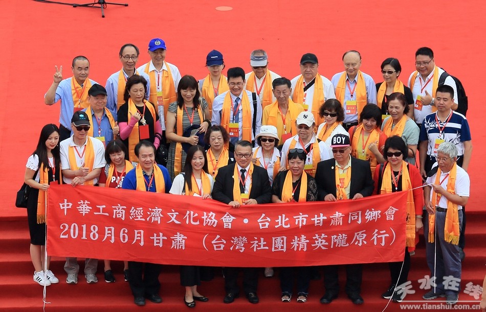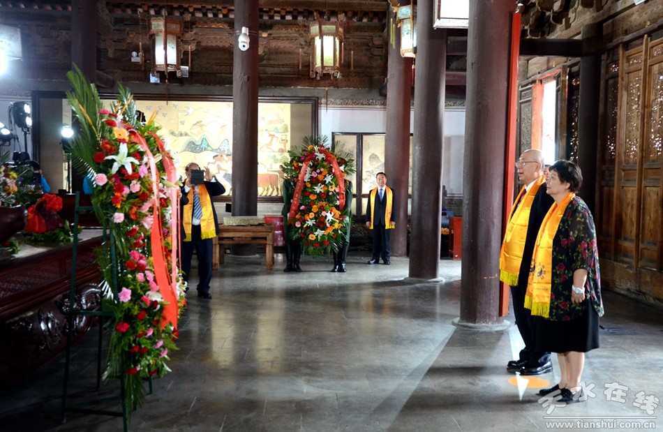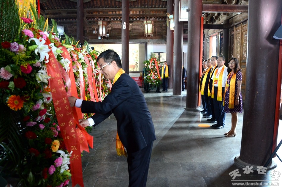 臺(tái)灣中華伏羲文化研究中心主任、全球粥會(huì)世界總會(huì)會(huì)長(zhǎng)陸炳文,英國(guó)福建工商聯(lián)合會(huì)會(huì)長(zhǎng)陳愛(ài)國(guó),加拿大西北同鄉(xiāng)總會(huì)會(huì)長(zhǎng)于鵬,中華工商經(jīng)濟(jì)文化協(xié)會(huì)理事長(zhǎng)、臺(tái)北市甘肅同鄉(xiāng)會(huì)理事長(zhǎng)李正言,中華泛藍(lán)聯(lián)盟執(zhí)行副秘書(shū)長(zhǎng)、高雄市茄萣區(qū)咨詢委員民意代表、茄萣小區(qū)理事長(zhǎng)聯(lián)合會(huì)會(huì)長(zhǎng)鄭志成,新西蘭太平洋資源集團(tuán)董事長(zhǎng)、新西蘭基督城中國(guó)姐妹城市委員會(huì)副主席邱明春代表臺(tái)灣參訪團(tuán)敬獻(xiàn)花籃。)