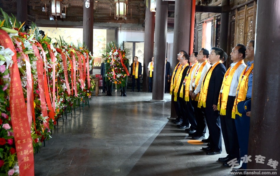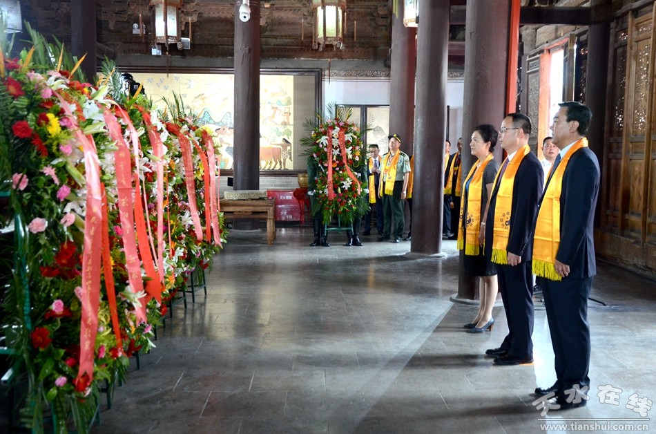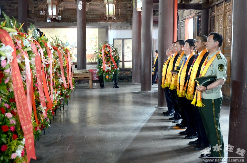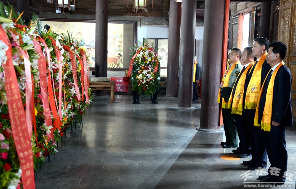 (天水市人大常委會(huì)主任蔣曉強(qiáng),天水市委副書(shū)記、市長(zhǎng)王軍,市政協(xié)主席張明泰,天水軍分區(qū)政委袁敬偉敬獻(xiàn)花籃。)