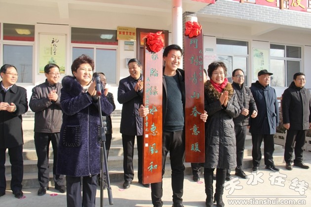 12月12日,由天水市楹聯(lián)學會承建的全市第一個楹聯(lián)文化村,在秦州區(qū)皂郊鎮(zhèn)田家山隆重舉行木刻楹聯(lián)贈送掛聯(lián)儀式。市人大常委會副主任蒲朝暉、市政協(xié)副主席屈光平出席活動,市委宣傳部副部長楊瑞峰,市社會組織黨工委書記郭治寧,秦州區(qū)領導曹亞玲、崔麗霞、胡秀玉,市博物館副館長、市楹聯(lián)學會會長劉玉璞等參加儀式,秦州區(qū)文廣局、區(qū)文聯(lián)、皂郊鎮(zhèn)負責人,市楹聯(lián)學會會員代表,新聞記者,田家山村民等近100多人參加活動。
