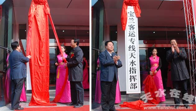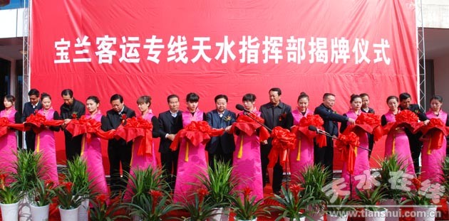 ▲2012年11月8日上午,位于天水市秦州區(qū)東十里工業(yè)示范區(qū)的寶蘭客運專線天水指揮部舉行揭牌儀式,標志著寶蘭客運專線天水段建設正式啟動。 天水市委書記馬世忠,蘭新鐵路甘青有限公司董事長、總經(jīng)理史克臣為指揮部揭牌。