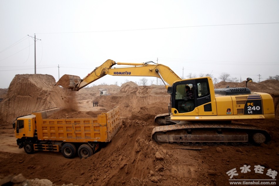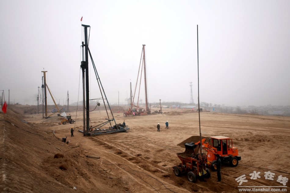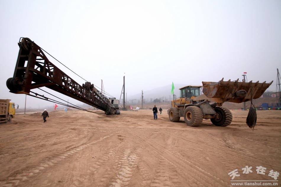 ▲2014年2月24日,寶蘭客專天水南站施工現(xiàn)場一片繁忙景象,多臺打樁機重錘交替砸向地下,發(fā)出砰砰砰的巨響;挖掘機、推土機等大型設備一字排開,開足馬力施工;大吊車、大貨車各種工程車來往穿梭。 (天水在線攝)