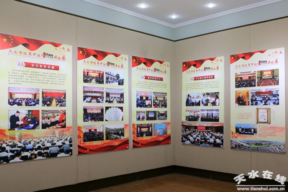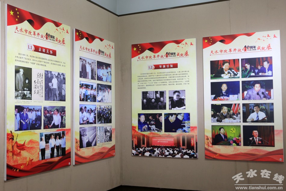 據(jù)了解,為展示天水人民40年來的奮斗歷程和輝煌成就,本次展覽以習(xí)近平總書記視察甘肅時(shí)提出的“八個(gè)著力”為指導(dǎo)思想,分“親臨指導(dǎo)”“堅(jiān)定不移從嚴(yán)治黨”“轉(zhuǎn)變發(fā)展方式提高綜合實(shí)力”“發(fā)展現(xiàn)代農(nóng)業(yè)增強(qiáng)供給能力”“全力推進(jìn)扶貧開發(fā)”“文化旅游融合發(fā)展”“著力提升城市綜合實(shí)力”“加強(qiáng)生態(tài)環(huán)境保護(hù)”“保障和改善民生”“平安建設(shè)深入推進(jìn)”等十個(gè)板塊,共150個(gè)版面1300余張圖片。用文字和圖片相結(jié)合,以圖片為主的形式,對(duì)天水市40年來所走過不平凡的歷程,特別是黨的十八大以來在改革開放中敢于拼搏、奮發(fā)有為的良好精神面貌,激勵(lì)全市上下不忘初心、牢記使命,開拓進(jìn)取、扎實(shí)工作,為加快推進(jìn)全面建成小康社會(huì)、建設(shè)幸福美好新天水所做出的成就進(jìn)行全方位展示。