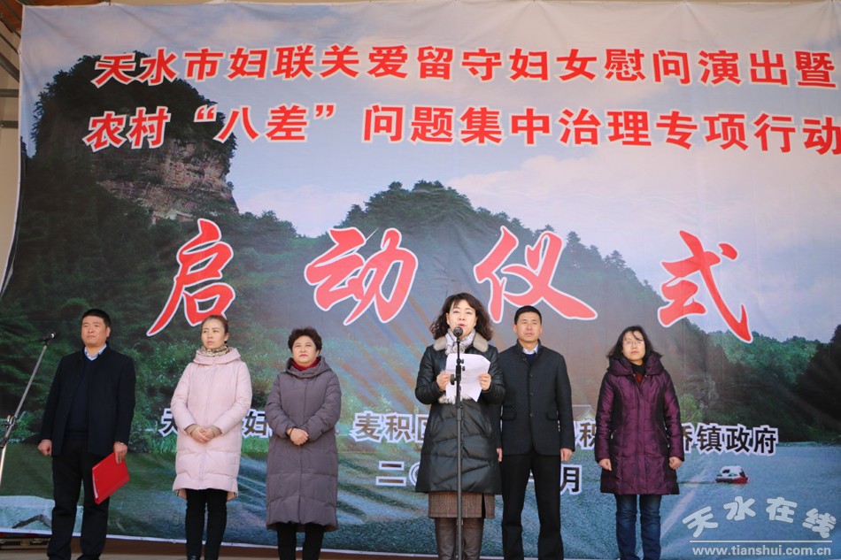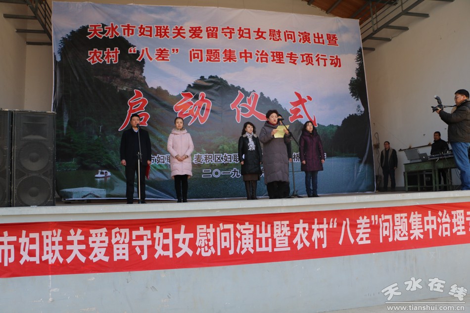 為了認(rèn)真貫徹落實(shí)習(xí)總書記對婦聯(lián)組織提出的引領(lǐng)、服務(wù)、聯(lián)系基層的指示精神,以實(shí)際行動(dòng)落實(shí)全市精準(zhǔn)扶貧戰(zhàn)略部署,2019年1月23日,在新春佳節(jié)即將到來之際,天水市婦聯(lián)在麥積區(qū)利橋鎮(zhèn)中心廣場舉行關(guān)愛留守婦女慰問演出暨農(nóng)村“八差”問題集中治理專項(xiàng)行動(dòng)啟動(dòng)儀式;顒(dòng)由市婦聯(lián)主辦,麥積區(qū)利橋鎮(zhèn)政府和麥積區(qū)婦聯(lián)協(xié)辦。市婦聯(lián)主席何忠蘭、市婦聯(lián)正縣級(jí)調(diào)研員曹亞玲,利橋鎮(zhèn)黨委書記劉亮、市婦聯(lián)權(quán)益部部長王玲霞、麥積區(qū)婦聯(lián)主席謝小蘭等出席了活動(dòng)。