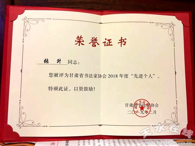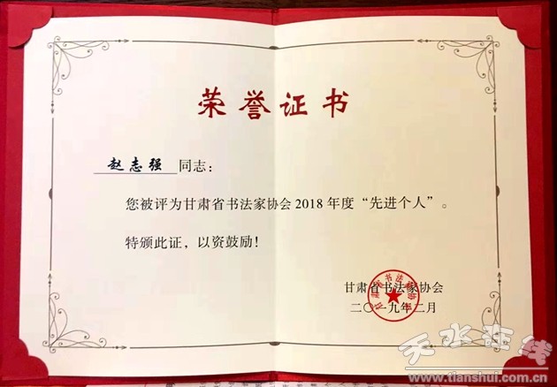 天水市書法家趙志強(qiáng)和張升被評為甘肅省書法家協(xié)會2018年年度“先進(jìn)個人”。