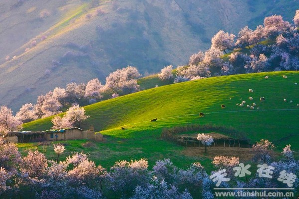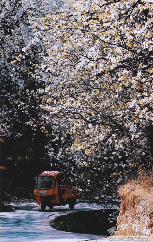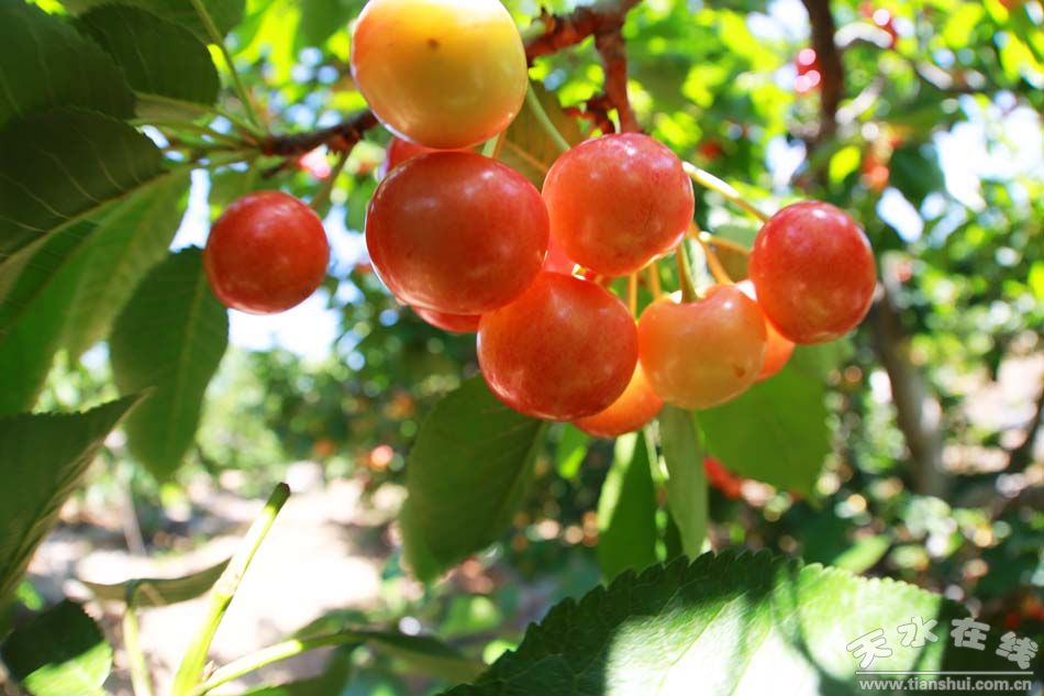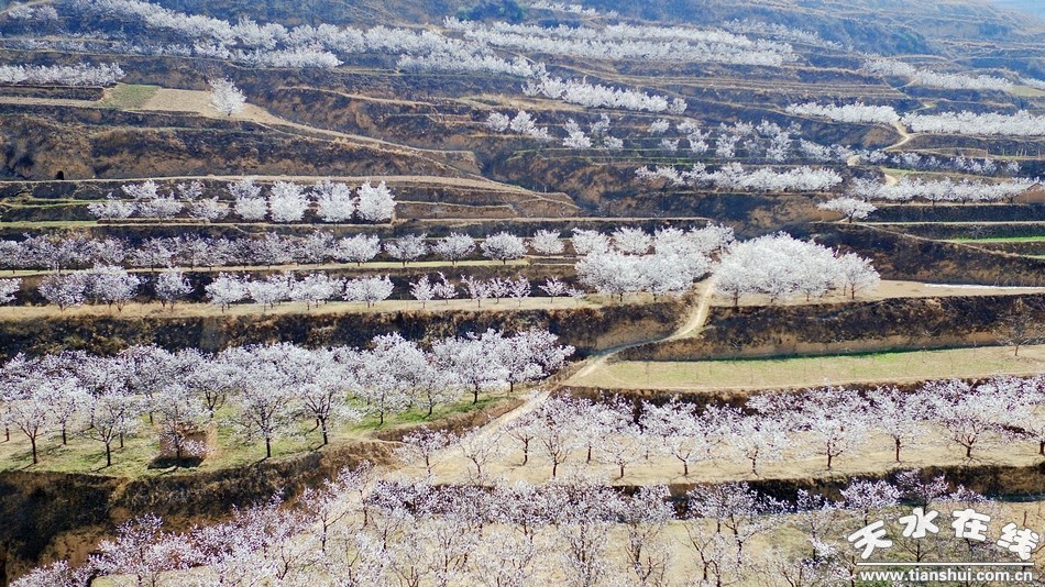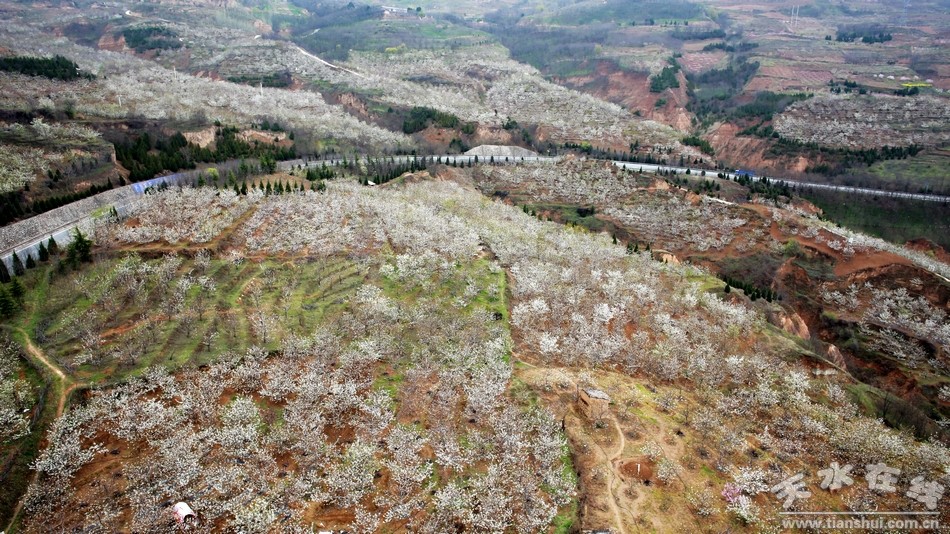 (甘肅天水,煙鋪櫻桃花海。)
