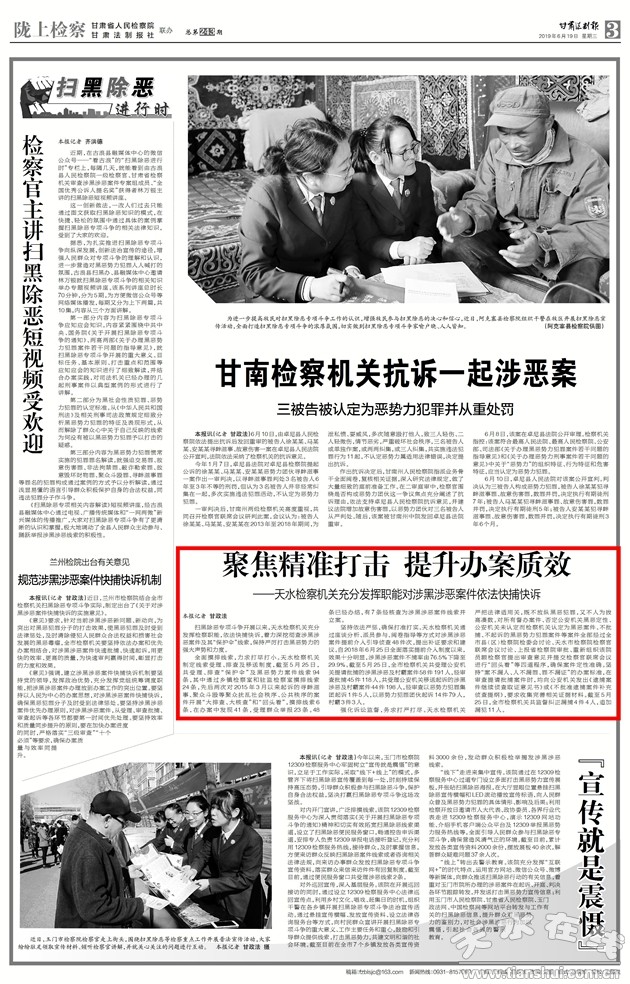2019年06月19日《甘肅法制報(bào)》刊發(fā)《聚焦精準(zhǔn)打擊 提升辦案質(zhì)效——天水檢察機(jī)關(guān)充分發(fā)揮職能對涉黑涉惡案件依法快捕快訴》。
