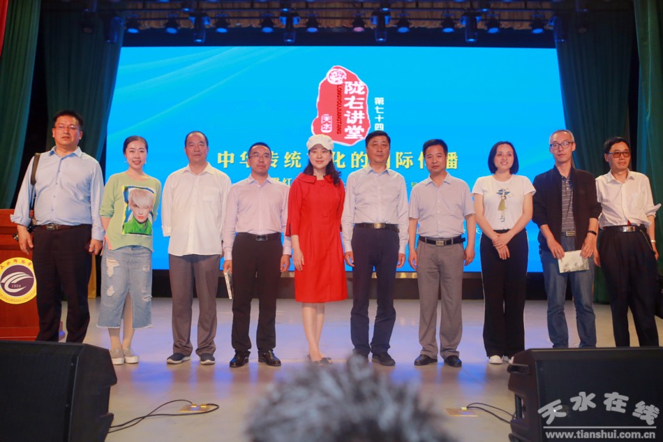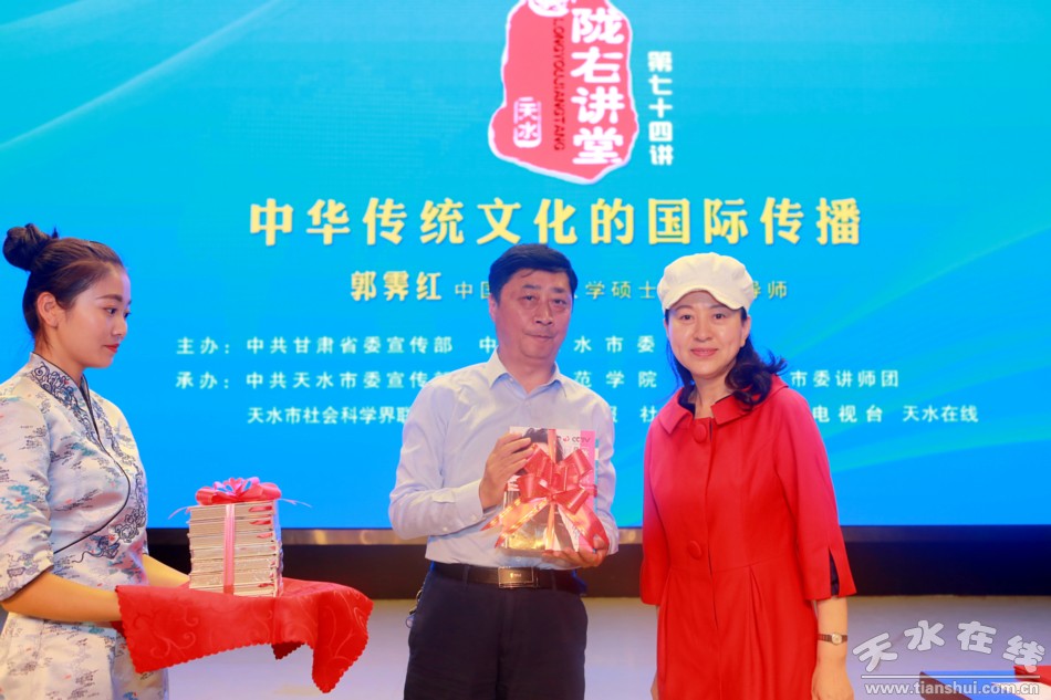 6月20日,隴右講堂第七十四講開講,邀請中央廣播電視總臺高級編輯、《中華情》創(chuàng)始人、總導演、中國傳媒大學碩士研究生導師郭霽紅女士作了題為《中華傳統(tǒng)文化的國際傳播》的專題講座。市人大常委會副主任安志宏,天水師范學院校長安濤,市直部門和師生代表等700多人聆聽講座。