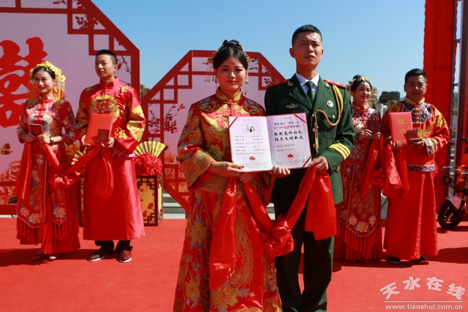 (清水縣委副書記、縣長馬越垠為14對(duì)新人證婚。)
