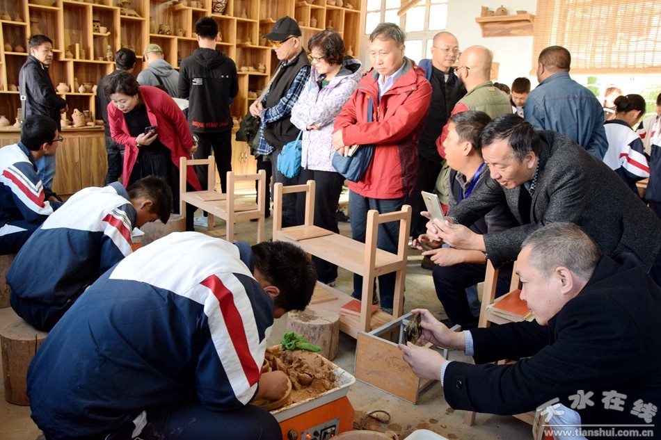 近午時(shí)分,采風(fēng)團(tuán)乘車前往秦安。下午首先抵達(dá)了秦安縣五營(yíng)中學(xué),參觀陶文化和校園詩(shī)歌創(chuàng)作。教室內(nèi),學(xué)生們宛如一個(gè)個(gè)手藝精湛的陶藝匠人,將看似平淡無(wú)奇的原材料化作一件件藝術(shù)品,引得詩(shī)人、作家們嘖嘖稱嘆。采風(fēng)團(tuán)與學(xué)生們進(jìn)行了深入的交流,不僅學(xué)習(xí)和了解了該校的陶文化普及,也在校園詩(shī)歌創(chuàng)作方面向?qū)W生們分享了自己的經(jīng)驗(yàn)。