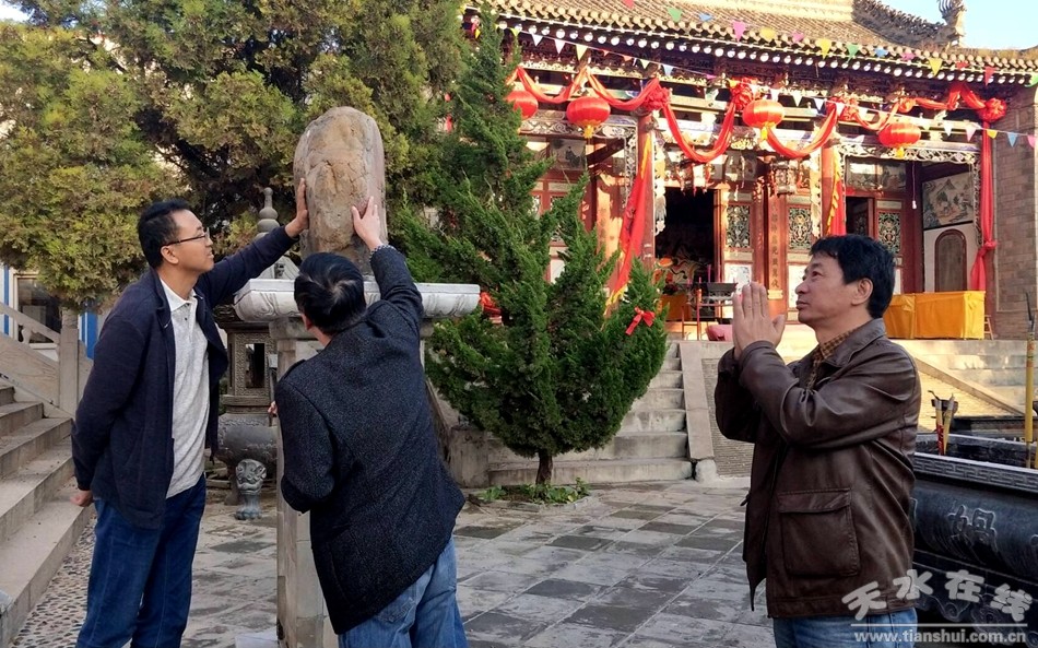 位于麥積區(qū)渭南鎮(zhèn)的卦臺(tái)山是采風(fēng)團(tuán)當(dāng)天的第一站。卦臺(tái)山如一條巨龍從群巒中探出頭來(lái),翠擁廟閣,渭水環(huán)流,鐘靈毓秀,氣象不凡。作家詩(shī)人們沿臺(tái)階向上,登臨卦臺(tái)山頂,俯瞰三陽(yáng)川。古老的渭河從西向東彎曲成一個(gè)“S”形,把橢圓形的三陽(yáng)川盆地一分為二,形成了一個(gè)天然的太極圖。采風(fēng)團(tuán)在卦臺(tái)山伏羲廟內(nèi)參觀祭拜,又一次紛紛感嘆天水的人杰地靈!暗堑缴巾敳虐l(fā)現(xiàn)大不同,卦臺(tái)山名不虛傳。”作家陳倉(cāng)精神十足,一邊稱贊,一邊讓朋友為他拍下與卦臺(tái)山的合影。