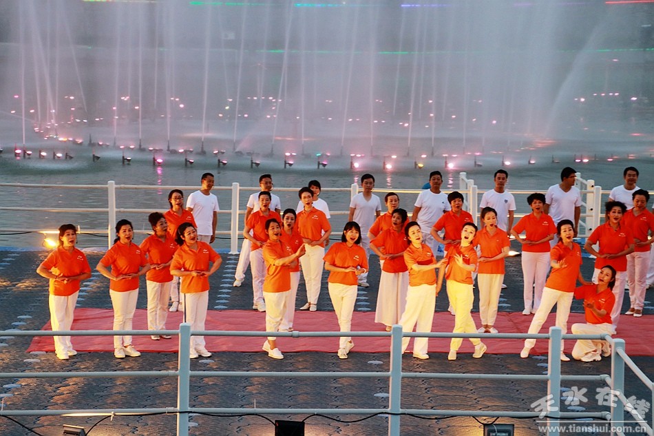 在上百名黨員重溫入黨誓詞之后,天水市職工合唱團先后上演了《沒有共產(chǎn)黨就沒有新中國》、《紅歌大聯(lián)唱》大合唱,《永遠的經(jīng)典》合唱表演和《我和我的祖國》大合唱。最后,由天水湖管理處和天水在線聯(lián)合推出的“大地灣女神+大美天水”音樂噴泉激情上演。