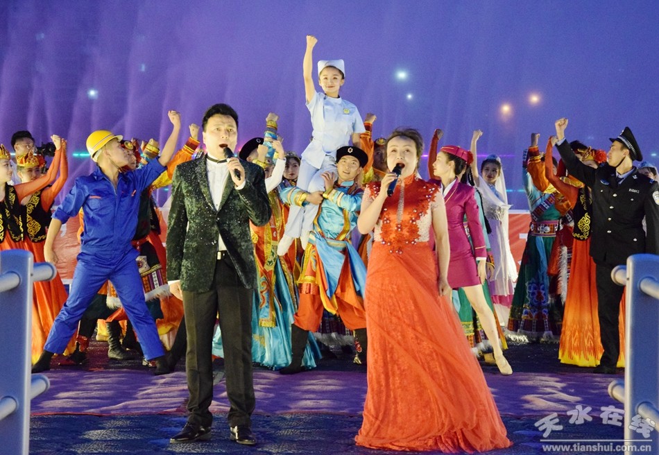 當(dāng)晚的演出從7點(diǎn)50分正式開始,8點(diǎn)40分結(jié)束。天水市歌舞團(tuán)“紅色文藝輕騎兵”先后演出了歌舞《母親是中華》、四重唱《我和我的祖國(guó)》、舞蹈《雨打芭蕉》、三重唱《幸福中國(guó)一起走》、舞蹈《麥積神韻》、合唱《國(guó)家》、民族聯(lián)舞《在你偉大懷抱里》和歌舞《復(fù)興的力量》。