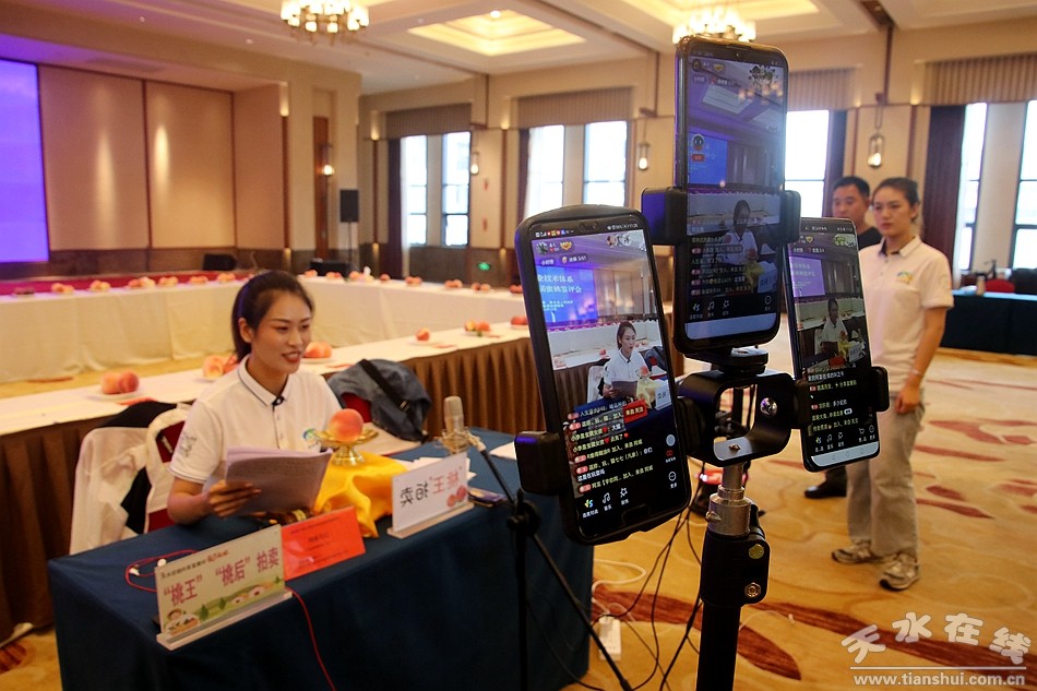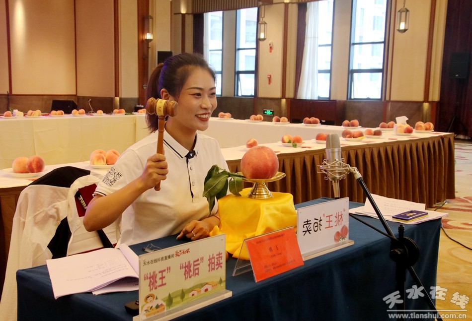 (天水在線主播萌萌通過天水在線抖音直播間拍賣“桃王”和 “桃后”,圖為拍賣現(xiàn)場。)