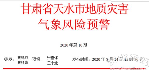 天水市自然資源局與天水市氣象局8月14日15時(shí)30分聯(lián)合發(fā)布地質(zhì)災(zāi)害Ⅰ級(jí)(紅色)氣象風(fēng)險(xiǎn)預(yù)警: