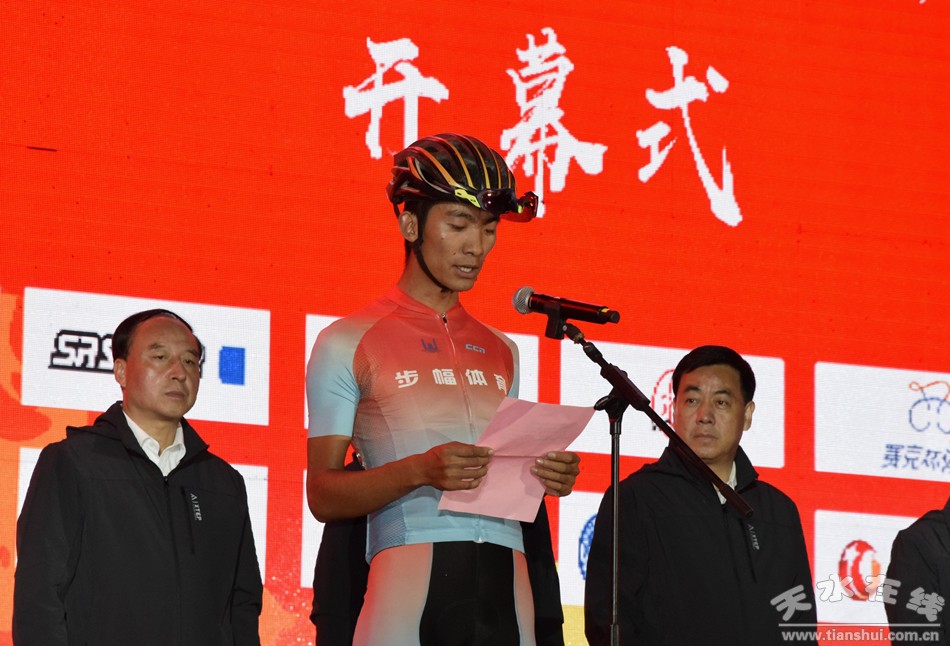 (天水步幅體育俱樂部自行車運(yùn)動員王小橋代表全體運(yùn)動員宣誓)