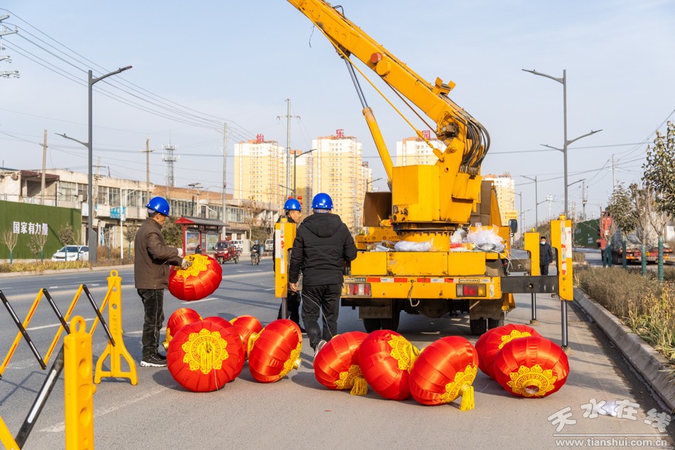 截止目前,已完成自由路、解放路、合作北路古樹串式燈籠、紅山路路燈燈桿中國結(jié)懸掛工作,現(xiàn)階段完成古樹懸掛燈籠220個,市政府門口燈籠24個,藉河北路燈籠120個,赤峪路燈籠97個,六中門前麥穗423珠,串串燈93串,紫色網(wǎng)片157片,解放路燈籠37個,其他路段的亮化工作正在有條不紊的開展,預(yù)計春節(jié)前夕前將全面完成亮化工作。屆時秦州城區(qū)將以更加絢麗多彩、吉祥喜慶的夜景,為廣大市民增添濃濃的新年暖意。