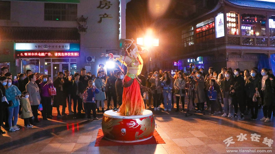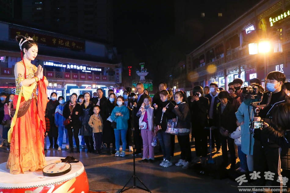 經(jīng)請示天水市文化和旅游局批準(zhǔn),3月12日晚,由天水市文化和旅游局主辦,天水在線承辦的“麥積飛天”2021年第一場演出,在秦州區(qū)中華西路步行街精彩上演。自此,天水在線將在每周五、周六晚上在秦州區(qū)中華西路步行街組織表演“麥積飛天”和“大地灣女神”舞蹈。