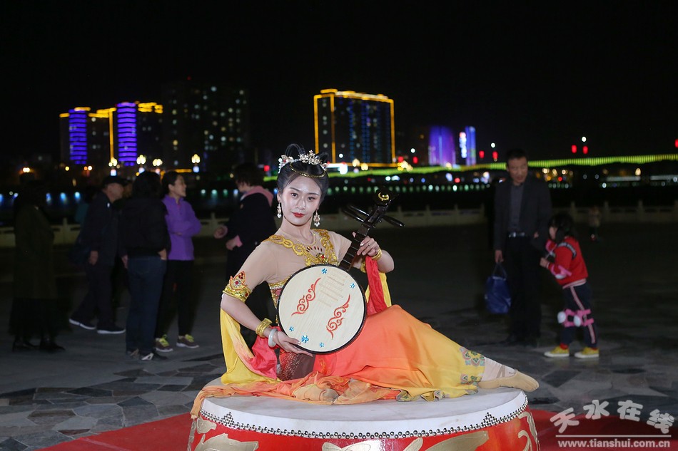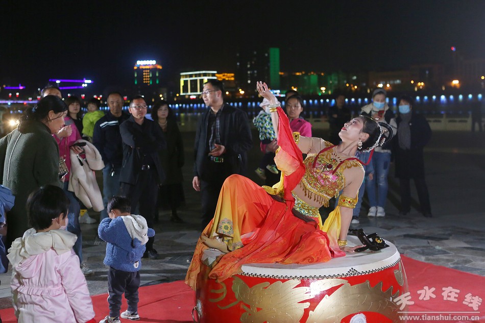 “麥積飛天”,由天水在線邀請?zhí)焖懈栉鑸F王時飛導演根據麥積山石窟飛天壁畫和天女散花的故事于2020年4月創(chuàng)編,由天水在線主播萌萌進行表演,2020年先后在天水湖音樂噴泉舞臺、天水“黃金大道”、秦州區(qū)中華西路步行街演出二十多場,對宣傳天水,發(fā)展天水“夜文化”、“夜旅游”,促進“夜經濟”發(fā)揮了積極作用,受到了社會各界的高度好評。
