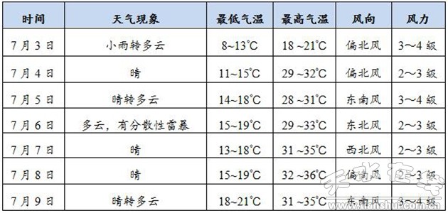 預(yù)計(jì)本周我市天氣以晴或多云為主,無(wú)明顯降水過(guò)程,7~9日氣溫較高,最高氣溫可達(dá)35~36℃。具體預(yù)報(bào)如下(白天到夜間):