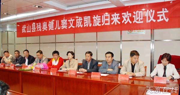 9月25日下午,武山縣在寧遠(yuǎn)大廈二樓會議室舉行儀式,歡迎殘奧健兒竇文成凱旋?h上領(lǐng)導(dǎo)溫利平、王永宏、劉長江、頡衛(wèi)星、郭海軍,康志鋒、麻保祿、馬進(jìn)以及縣直相關(guān)部門負(fù)責(zé)人出席儀式。歡迎儀式由副縣長宋玉香主持。