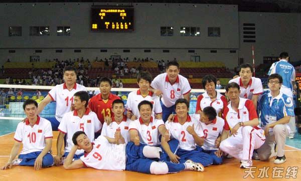 (中國男子坐式排球全體隊員合影,2號為運動健兒竇文成)