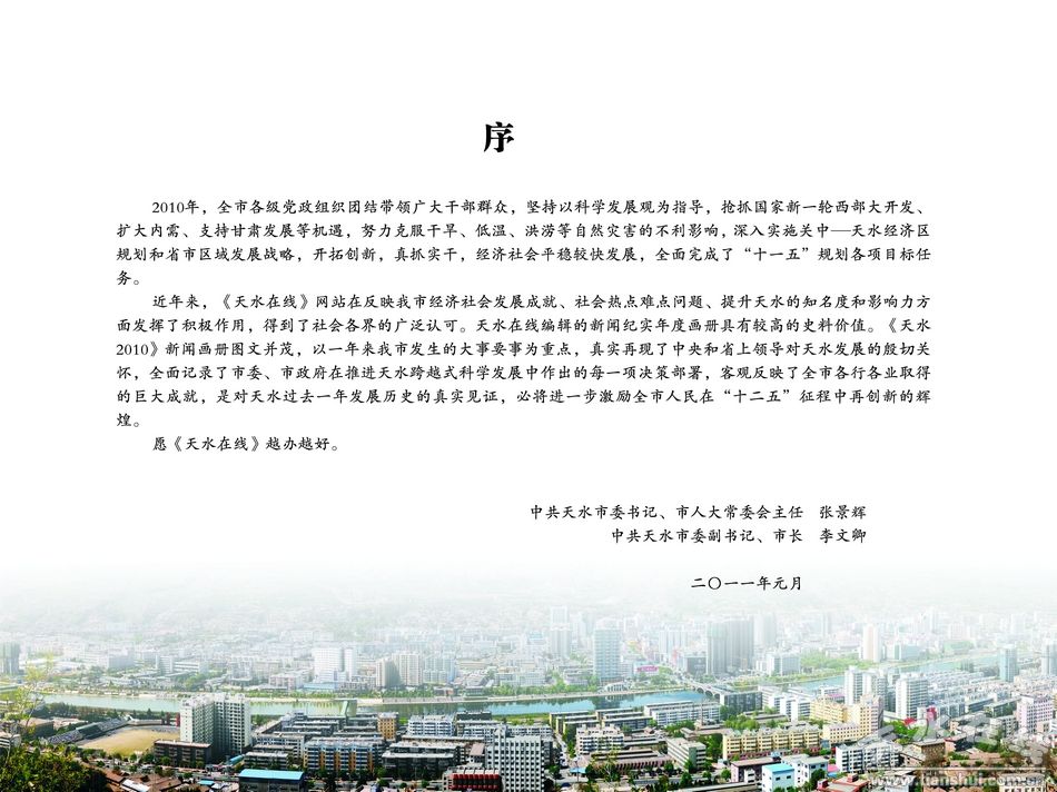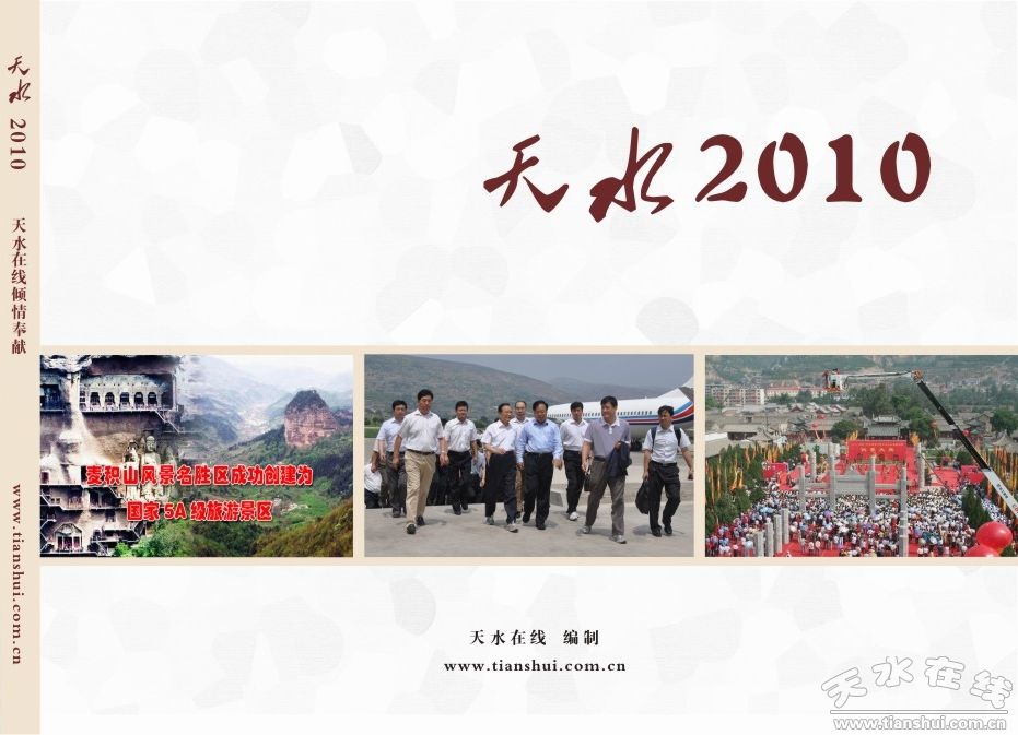 1月19日,由甘肅省政協(xié)副主席、中共天水市委書記、市人大常委會(huì)主任張景輝,中共天水市委副書記、市長(zhǎng)李文卿作序,天水在線為今年天水“兩會(huì)”精心設(shè)計(jì)制作的《天水2010》新聞畫冊(cè)正式面向“兩會(huì)”代表、委員贈(zèng)閱。