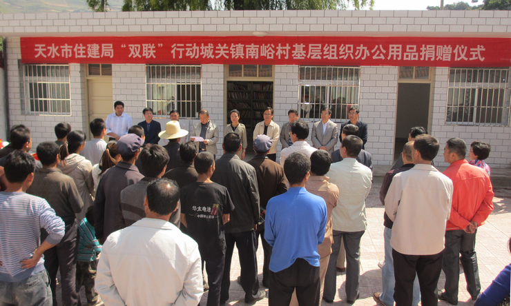 9月19日,天水市住建局在城關(guān)鎮(zhèn)南峪村舉行村級(jí)組織活動(dòng)場(chǎng)所辦公用品捐贈(zèng)儀式。市住建局副局長(zhǎng)張長(zhǎng)平、吳健、馬延廣以及局機(jī)關(guān)各科室負(fù)責(zé)人出席了捐贈(zèng)儀式;武山縣委副書記蔣小麗,縣委常委、城關(guān)鎮(zhèn)黨委書記柳選植參加了捐贈(zèng)儀式。