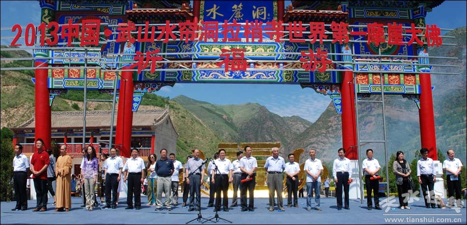 六月的武山萬木蔥蘢,洞天福地嘉賓云集。6月23日,2013水簾洞·拉梢寺世界第一摩崖大佛祈福游在水簾洞景區(qū)舉行。來自國內(nèi)外的嘉賓相聚在鐘靈毓秀的大福武山,祈福納祥,共話發(fā)展。