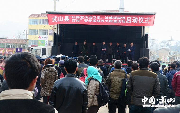 1月21日,武山縣“法律宣傳進(jìn)萬家、法律援助進(jìn)百村”暨矛盾糾紛大排查活動(dòng)啟動(dòng)儀式在灘歌鎮(zhèn)舉行?h委常委、政法委書記王志軍出席啟動(dòng)儀式并作講話。縣司法、法院、公安、安監(jiān)、食藥監(jiān)、執(zhí)法、國土、環(huán)保、運(yùn)管、消防、宣傳等部門領(lǐng)導(dǎo)干部及灘歌鎮(zhèn)干部群眾共計(jì)500余人參加了啟動(dòng)儀式。啟動(dòng)儀式由縣司法局局長康元貴主持。