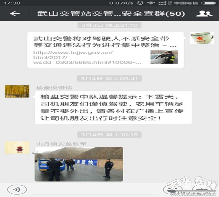 近期,武山縣境內(nèi)天氣多變,雨雪頻發(fā),部分山區(qū)道路結(jié)冰現(xiàn)象嚴(yán)重。據(jù)此,武山縣交警部門利用微信群及時發(fā)布了交通安全提示和勸導(dǎo)信息,以及部分班線車停運和道路封閉的公告。充分利用微信群傳播速度快,宣傳面廣的特點,讓廣大駕駛員和群眾合理安排出行,預(yù)防和減少交通事故發(fā)生。