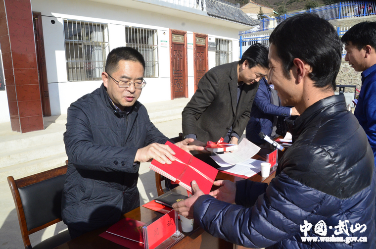 11月7日,武山縣首批農(nóng)村土地承包經(jīng)營(yíng)權(quán)證頒證儀式在龍臺(tái)鎮(zhèn)青山村舉行?h委副書(shū)記閆斌出席頒證儀式并講話,縣政府副縣長(zhǎng)令軍強(qiáng)主持頒證儀式?h土地確權(quán)領(lǐng)導(dǎo)小組成員單位負(fù)責(zé)人及龍臺(tái)鎮(zhèn)黨政班子成員、部分村駐村干部及村干部,青山村村民代表,北京世紀(jì)國(guó)源科技發(fā)展股份有限公司負(fù)責(zé)人參加頒證儀式。