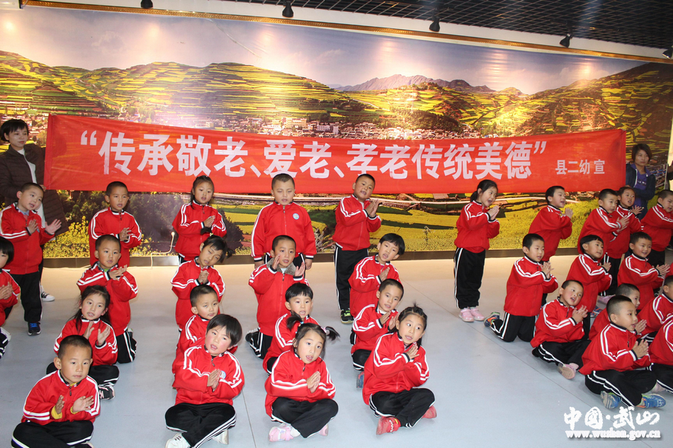 文藝表演中,武山縣老年大學(xué)師生的《太極拳》表演行云流水,一招一式中蘊(yùn)含著儒道哲學(xué);合唱《茉莉花》、《共筑中國(guó)夢(mèng)》深情歡快,唱響了“莫道桑榆晚,為霞尚滿(mǎn)天”的瑰麗生機(jī);城關(guān)第五小學(xué)帶來(lái)的朗誦《話(huà)重陽(yáng)·頌祖國(guó)》激情洋溢,從重陽(yáng)節(jié)唱誦到對(duì)祖國(guó)的熱愛(ài)。一群吉祥寶貝帶來(lái)的草原舞蹈《吉祥三寶》歡快活潑,滿(mǎn)載童真和吉祥;武山第二幼兒園的老師帶來(lái)的《常回家看看》唱出人們對(duì)家最繾綣的眷戀,唱出“每逢佳節(jié)倍思親”的故土情懷,學(xué)生集體朗誦《重陽(yáng)節(jié)的歌》稚嫩可愛(ài),流露出他們對(duì)爺爺奶奶的感恩之情;博物館講解員的獨(dú)唱《好人一生平安》滿(mǎn)懷深情,人間有情,大愛(ài)無(wú)疆,集體朗誦《歲歲重陽(yáng),今又重陽(yáng)》表達(dá)了她們?cè)谥仃?yáng)節(jié)——這個(gè)敬老、愛(ài)老、養(yǎng)老的節(jié)日給予老人們最深的祝福。