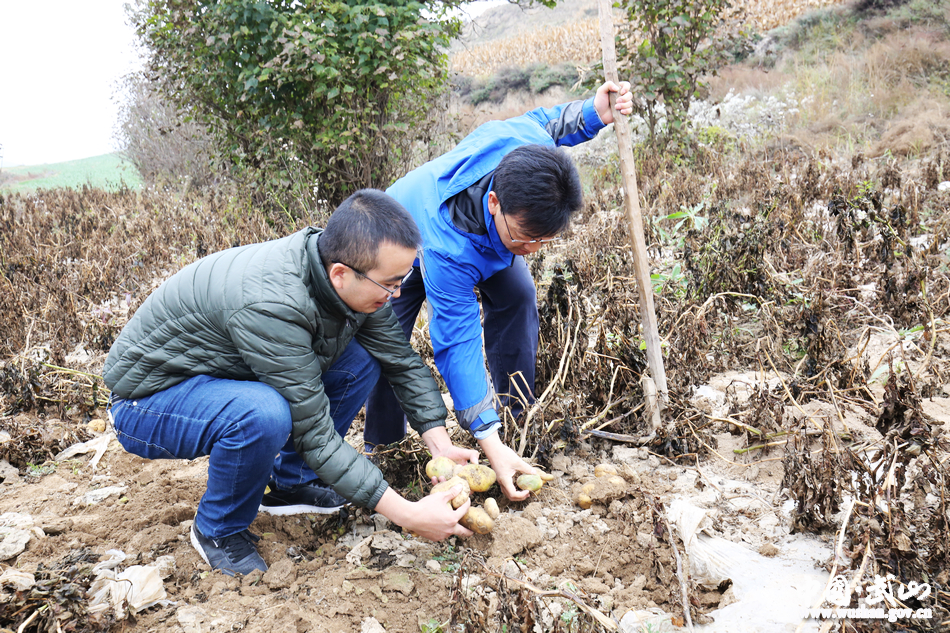 沿著新修建拓寬的產(chǎn)業(yè)路,王明壽一行來到了鳴鼓村秦家寺自然村貧困戶康金換家的洋芋地里,和他們一家一起挖洋芋,拉家常,了解村上及貧困戶生產(chǎn)生活情況。