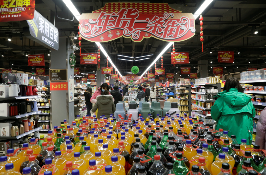在位于渭北福萬家超市,記者看到,春聯(lián)、福字及各種虎年配飾等年俗飾品被商家擺在顯眼位置,紅彤彤的一片,煞是好看。貨架上琳瑯滿目的年貨商品、打折促銷商品、年貨禮盒應(yīng)有盡有,上方懸掛的虎年玩偶,更烘托出了喜慶的氛圍。在超市副食品區(qū)域,各種新鮮的蔬菜水果、南北干貨、糧油面點(diǎn)、肉禽蛋類品類繁多,令人眼花繚亂。為確保購物環(huán)境安全和人員安全,超市安排專人在入口處進(jìn)行二碼聯(lián)查,提醒顧客測量體溫并讓進(jìn)店顧客戴好口罩,同時(shí)對(duì)超市購物車、購物籃進(jìn)行嚴(yán)格消毒。
