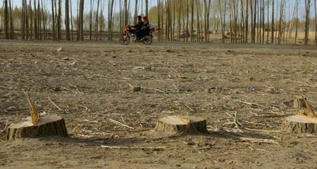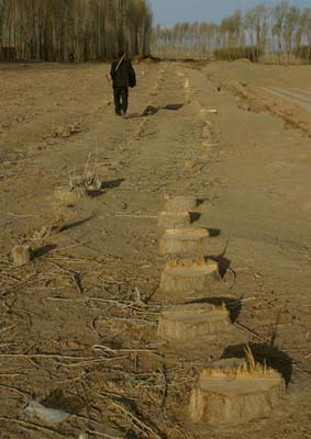 | 2007年4月27日,護(hù)林帶上的樹木被砍伐掉,村民行走的村莊道路還能保留多久。 |