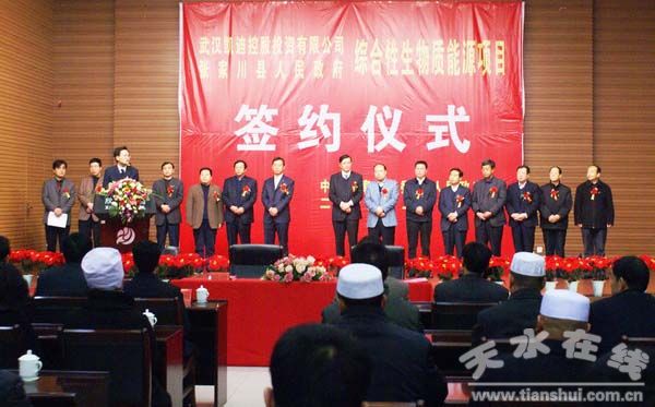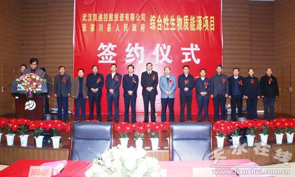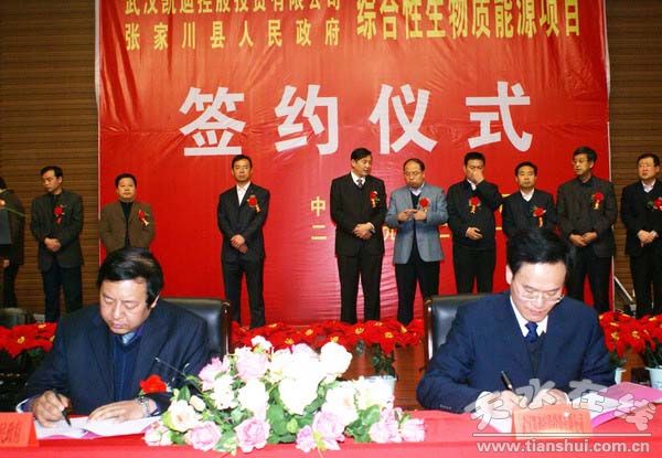 。R存福 竇苗苗)2008年2月19日,在天水市欣大酒店,張家川縣與武漢凱迪控股投資有限公司簽訂生物質(zhì)能源林基地建設(shè)項目,天水市政府副市長趙衛(wèi)東、副市長彭鴻嘉、天水市招商局局長索鴻賓以及張家川縣四大組織領(lǐng)導(dǎo)蒲軍、李升平、馬小龍、李棟一、趙川平、馬全榮等領(lǐng)導(dǎo)出席了簽約儀式。