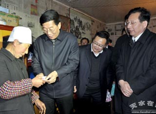 張家川縣自然條件差,基礎(chǔ)設(shè)施薄弱,經(jīng)濟(jì)發(fā)展滯后,貧困程度深,全縣60%的村地處海拔1800米以上,40%的村處于海拔2000米以上,全縣有180個村280公里的通村道路不暢,79個村5.7萬人口沒有列入農(nóng)村安全飲水項目,全縣有220個貧困村,有6.97萬貧困人口,全縣有240個村無標(biāo)準(zhǔn)化衛(wèi)生所,扶貧開發(fā)面臨的形勢仍然十分嚴(yán)峻,任務(wù)十分艱巨。加快張家川脫貧步伐一直是徐省長最牽掛的事,特別是貧困群眾的生產(chǎn)生活一直牽動著徐省長的心。他來到馬鹿鄉(xiāng)牌樓村馬續(xù)兒家。一進(jìn)屋,徐省長就拉著主人的手,深情地說:“去年你們家的收入有多少,農(nóng)村合作醫(yī)療參加了沒有,你們生產(chǎn)生活上還有哪些困難,今天我代表省委、省政府特地來看看你們。” 馬續(xù)兒從徐省長手中接過慰問金,告訴徐省長,依靠黨和政府的好政策,參加了新農(nóng)合,看病也不太愁了。 “國家給的各種惠農(nóng)補(bǔ)貼發(fā)到手了嗎?”徐省長問!鞍l(fā)到手了,在這兒呢!”馬續(xù)兒說著,從抽屜里拿出財政補(bǔ)貼明白冊, 徐省長接過小冊子,一邊看,一邊笑著對馬續(xù)兒說:“這就好,現(xiàn)在群眾最迫切需要解決什么問題。” 一旁的村干部接過話茬說:“村上通自來水的管道生銹了,更換需24萬元,群眾出行還很難,需硬化道路資金60萬元! 徐省長叮囑隨行的省扶貧辦主任沙拜次力,今年一定要把牌樓村列為整村推進(jìn)項目。他鄭重地告訴鄉(xiāng)親們:這兩項困難今年一定能夠解決。 馬續(xù)兒激動地說:“你們冒著這么大的雨,來看望我們,并給我們村解決了行路難、吃水難的問題,我們從心眼里感謝黨!感謝人民政府!”