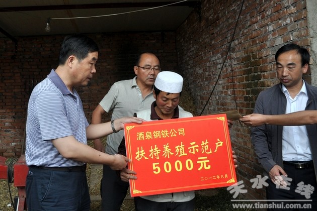 (酒鋼集團黨委書記、副董事長陳春明給養(yǎng)羊示范戶付魚兒送上扶持基金 )