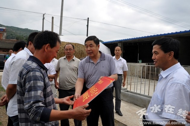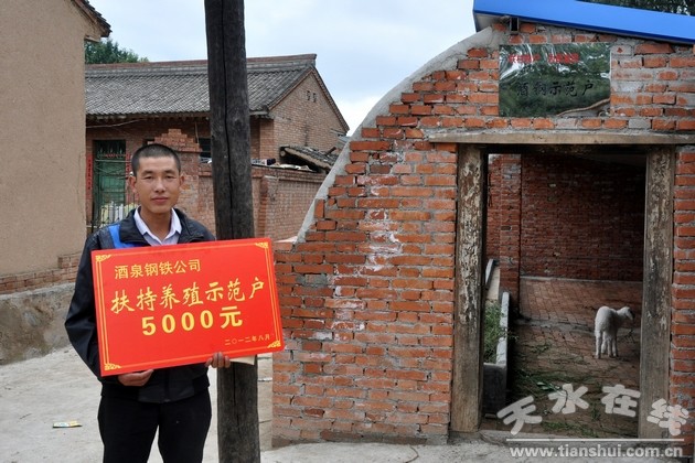 (酒鋼集團黨委書記、副董事長陳春明給養(yǎng)羊示范戶趙金送上扶持基金)