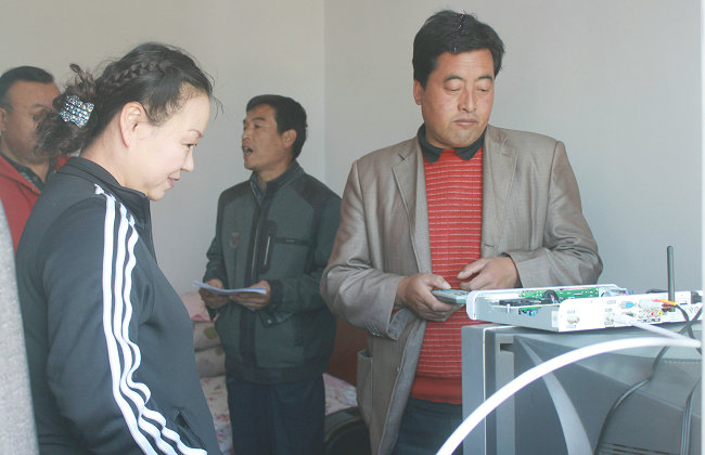 在下龐村 “戶戶通”接收設(shè)備工程安裝點上,王春丁詳細了解工程設(shè)備質(zhì)量、工程進度,現(xiàn)場指導技術(shù)人員進行設(shè)備安裝調(diào)試與激活,并與農(nóng)戶交談了解設(shè)備安裝收費、電視接收信號是否穩(wěn)定等情況。