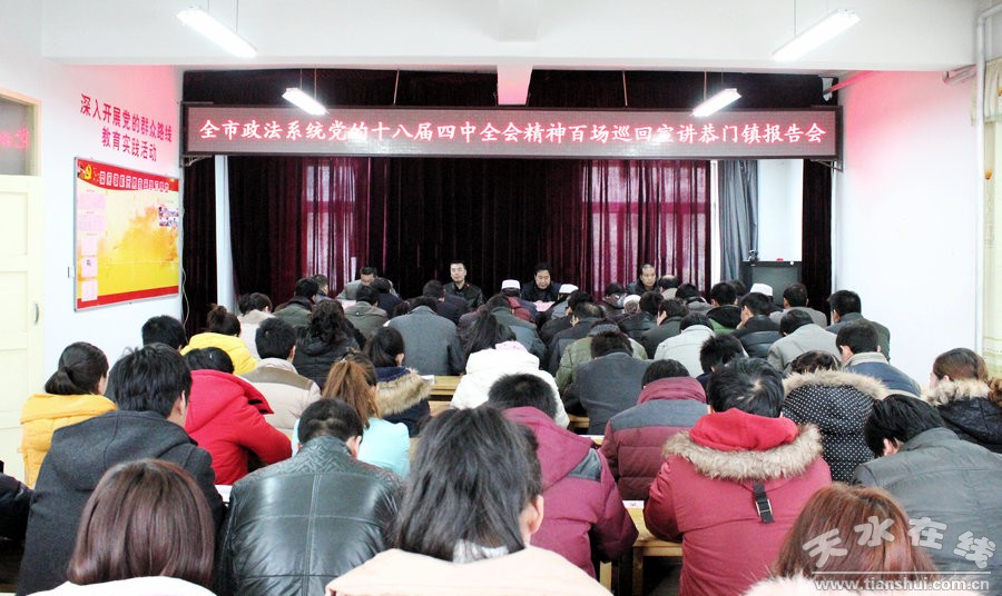 全市政法系統(tǒng)十八屆四中全會(huì)精神“百場(chǎng)巡回宣講”報(bào)告團(tuán)分三組先后深入恭門鎮(zhèn)、胡川鄉(xiāng)、張棉鄉(xiāng)等鄉(xiāng)鎮(zhèn),向鄉(xiāng)鎮(zhèn)機(jī)關(guān)干部、鄉(xiāng)屬各單位負(fù)責(zé)人、鄉(xiāng)屬各村黨支部書記、部分群眾代表宣講黨的十八屆四中全會(huì)精神,受到了廣大干部群眾的熱烈歡迎。