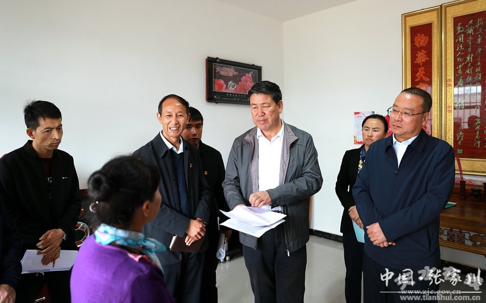在兩村實地查看過程中,王軍隨機抽查走訪了6戶貧困戶,與他們一一親切交談,詳細了解他們的生產(chǎn)生活、扶貧政策宣傳落實、幫扶責(zé)任人到崗和幫扶作用發(fā)揮情況,鼓勵他們增強脫貧致富的信心,堅決克服“等、靠、要”的思想,努力通過勤勞的雙手過上幸福的生活。在水泉村貧困戶柴小紅家,當(dāng)王軍聽說柴小紅弟弟柴宏錄是張家川縣2016年理科狀元,現(xiàn)就讀于西安電子科技大學(xué),妹妹柴蕭燕在張家川縣第一中學(xué)上學(xué),系因?qū)W致貧的情況后。王軍對柴小紅的母親深情地說:“讀書能改變命運。你的幾個孩子學(xué)習(xí)優(yōu)秀,成績突出,是對你們?nèi)易畲蟮陌参,再苦再累也要堅持供給孩子讀書,完成學(xué)業(yè),千萬不可半途而廢,孩子將來一定可以大有作為!”