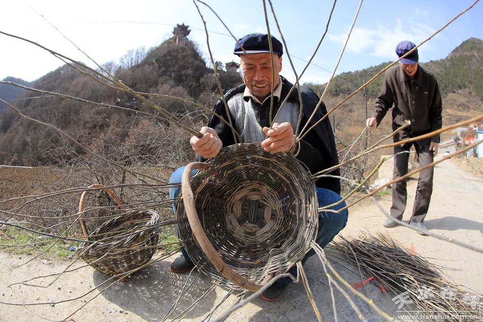 在黑潭寺的山腳下,我們遇到兩位老人在用細長的藤條編鋬籠!拔覀冞@鋬籠做了三四十年了,靠的都是人工拗折和拔拉!笨吹接腥寺愤^,其中一位叫馬雙義的老人笑著對我們說。走近一看,路邊擺放著已經(jīng)起好的籠底,木條在兩位老人的挑動中“唰唰唰”地晃動著,速度之快,讓小編根本看不清一根根木條是如何編織成鋬籠的。