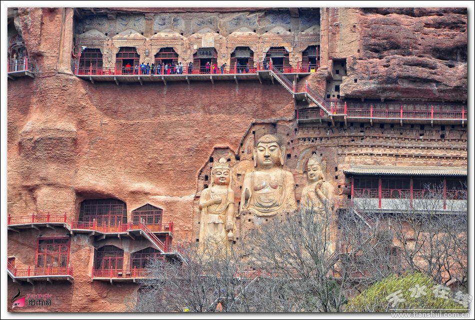 麥積山石窟位于甘肅省天水市麥積區(qū),小隴山的一座孤峰,高142米,因山形似麥垛而得名。麥積山石窟始建于384-417年,從十六國后秦時開窟造像,歷經(jīng)北魏、西魏、北周、隋、唐、五 代、宋、元、明、清,現(xiàn)存221座洞窟、10632身泥塑石雕、1300余平方米壁畫。被譽為東方雕塑藝術(shù)陳列館。