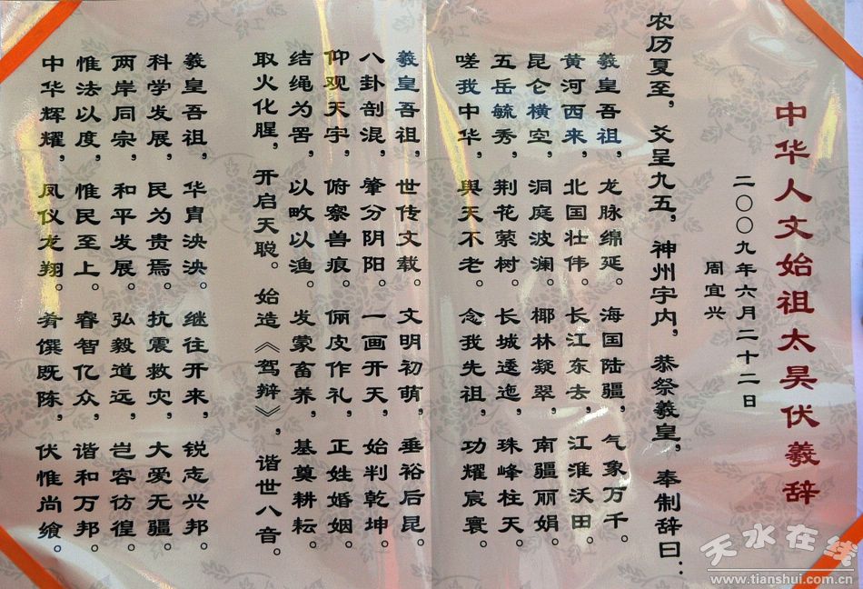 2008年,因“5.12”大地震、2009年因災(zāi)后重建任務(wù)繁重,甘肅省政府決定暫停舉辦2008年、2009年公祭伏羲大典。為“弘揚伏羲精神,傳承中華文明”,增加增強民族凝聚力和文化認同感,保持伏羲祭祀活動的連續(xù)性、滿足海內(nèi)外同胞祭祀心愿。經(jīng)協(xié)商,2009(己丑)年中華人文始祖伏羲祭祀儀式由全國性社團組織——中華伏羲文化研究會主辦,天水市文化文物出版局、市伏羲文化研究中心、市委臺灣工作辦公室承辦。