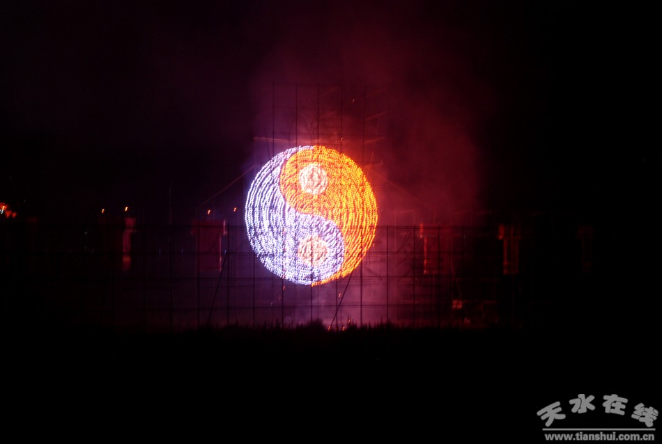 ▲晚九點整,音樂焰火晚會正式拉開了序幕。綠牡丹、黃千輪、金波藍、色連珠花以及各式中空禮花,穿插特效花束、燭光、虎尾等組合電腦特技表演的效果,活力四射、青春律動、把和諧之美展示無余。絢爛的焰火爭奇斗艷,相互輝映,映亮了整個秦州夜空。